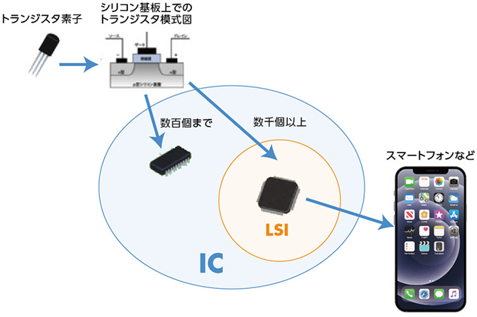 シリコン半導体基板上にトランジスタや抵抗、コンデンサなどの極小素子を形成して電子回路を構成したものをIC(Integrated Circuit、集積回路)と言う。ICの中でも1つのシリコン半導体基板上に数千〜数万以上のトランジスタを集積するものがLSIと呼ばれる。日本語に訳すと「大規模集積回路」。