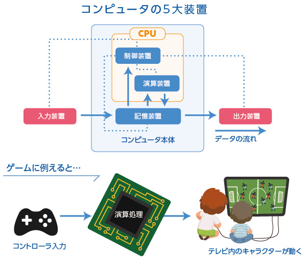 コンピュータとは外部からなんらかの情報を入力し、その情報を元にさまざまな処理を行い、結果を出力する機械です。この一連の処理に必要な要素を簡潔にまとめたものをコンピュータの5大装置と呼び、入力および出力は5大装置の一角を担うものです。入出力機器があって初めて、私たちはコンピュータに処理をさせて、その結果を目にすることができます。