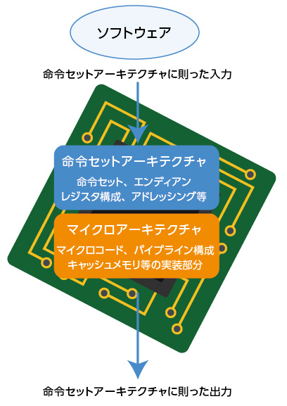 命令セットアーキテクチャは、CPUの動作について「こうすればこう動く」ということを定めたものです。ソフトウェア側から見たCPUの動かし方とその結果について仕様を定めたもので、実際のCPU内部をどのように実装するかには触れていません。入力と出力が規定通りならば中身の処理は何でもOKというわけです。このように仕様と切り離された内部実装のことをマイクロアーキテクチャと呼びます。