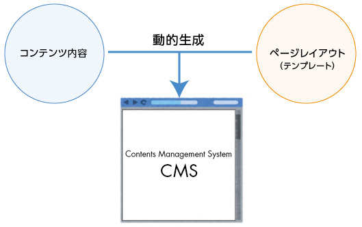 またユーザーのリクエスト対応の必要がない場合でも、Webサイトを効率よく運用管理するために動的生成を用いている場合があります。Webサイトをコンテンツ(内容)とページレイアウトに分けて管理する動的コンテンツ管理システム(動的CMS:Contents Management System)を利用する場合です。動的CMS(Contents Management System)を導入すると必然的に動的生成のWebサイトになるのです。