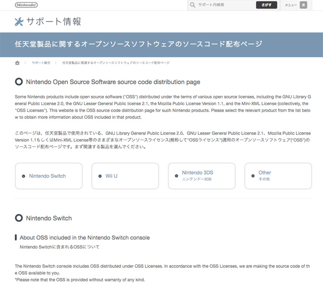 任天堂製品に関連するオープンソースソフトウェアのソースコード配布ページ