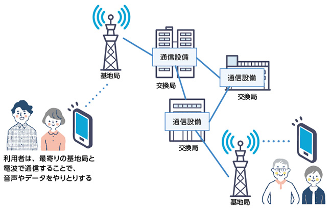 携帯電話やスマートフォンは、電波を使って、音声やデータをやりとりしています。この電波を送受信するのが基地局です。