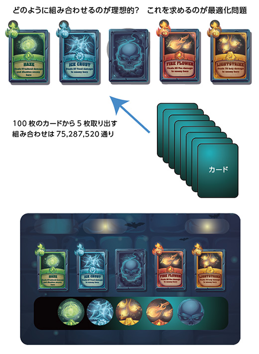 「数学の組み合わせ」を知っている人ならわかりますが、仮に自分が100枚のカードを持っているのなら、100C5=(100×99×98×97×96)÷(5×4×3×2×1)=75,287,520通りの組み合わせがあります。現在のコンピュータなら、このぐらいの組み合わせをすべて試すことは可能ですが、これが1万枚のカードとなると、すべて試すと、とてつもない時間がかかってしまいます。