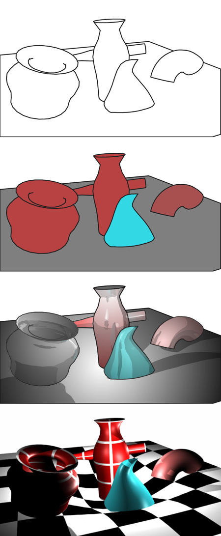 レンダリングでは、カメラの向きによって、全体が切り抜かれます。どのような色合いになるのかは、光源から実際に出る光を計算し、物体に当たったときには、その反射率に応じて反射させるなど複雑な計算をします。当然、ある物体の後ろにある物体は隠れますし、影も付きます。アニメーションを作るときは、カメラや物体を動かしながら、1コマ1コマ作成し、レンダリングしていきます。
