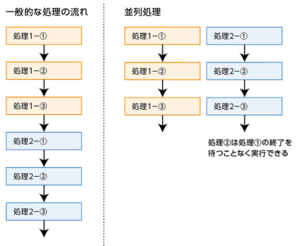 並列処理は、複数の処理を並行して同時に動かす仕組みです。それぞれの処理は、独立して動くことから「非同期処理」とも呼ばれます(「同期」とか互いに相手の状態を確認しながら処理を進めることを言います)。