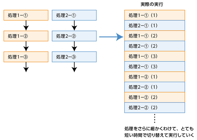 そのため実際には、同時に実行するのではなく、OSなどのソフトウェアがもつ「タスクスケジュール」という機能によって、複数の処理を分割し、それぞれをとても短い時間で切り替えて実行することで、あたかも並列に実行されるようにする機構で実現されています。