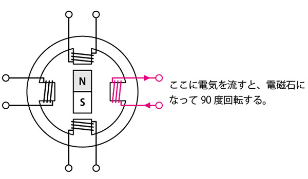 ステッピングモーターは、指定した角度だけ回転するモーターです。中心に磁石があり、それを囲むようにコイルがあります。特定のコイルに電気を流して電磁石にすれば、引っ張られて、その位置に回ります。どのコイルに、どの順序で電気を流すのかを細かく制御することで、指定した角度だけ回します。ステッピングモーターは、工場で部品を指定した場所に運んだり、ネジ止めしたりするなど、人間に似た動きをするロボットを作るのに必須の部品です。