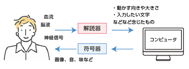 人脳とコンピュータとをつなぐ装置。脳波や神経信号、血流などを検出して分析してコンピュータに取り込む。念じるだけでコンピュータに指示を出したり、コンピュータから視覚や味覚、聴覚などを人間に与えたりできる。