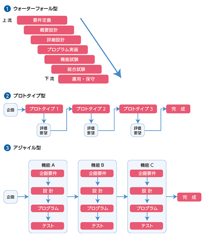 開発プロセスにはいくつかの方式があり、どの方式を採るかで開発の進め方もまったく異なってきます。代表的なものとして「ウォーターフォール型」「プロトタイプ型」「アジャイル型」の3つが挙げられます。